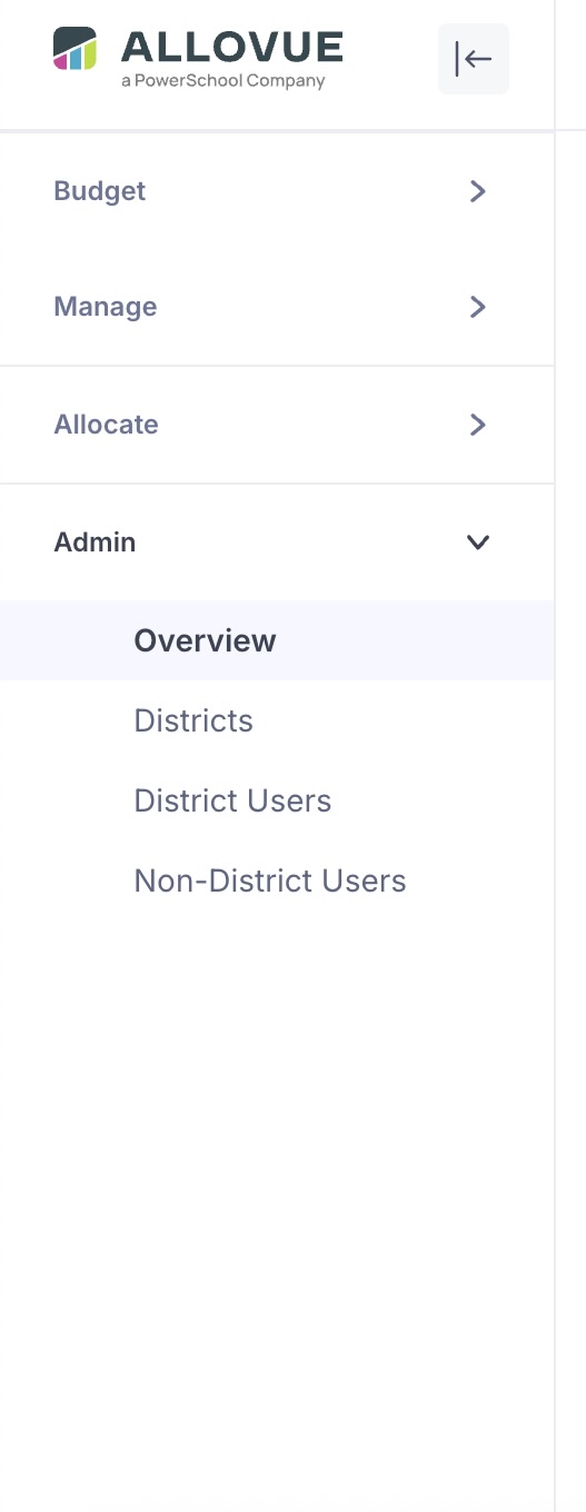 | Allovue.app-> Current-> All Accounts | No Change | Review Allovue Accounts Page | Manage Admin users in the All Budgets menu |