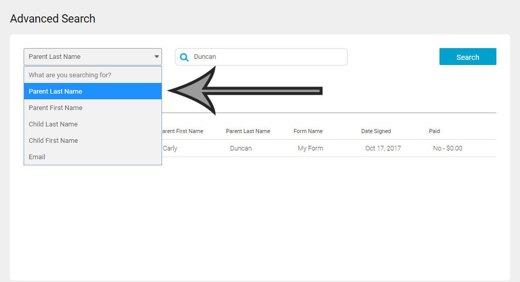 You can search by Parent First and Last Name, Child First and Last Name as well as by email.