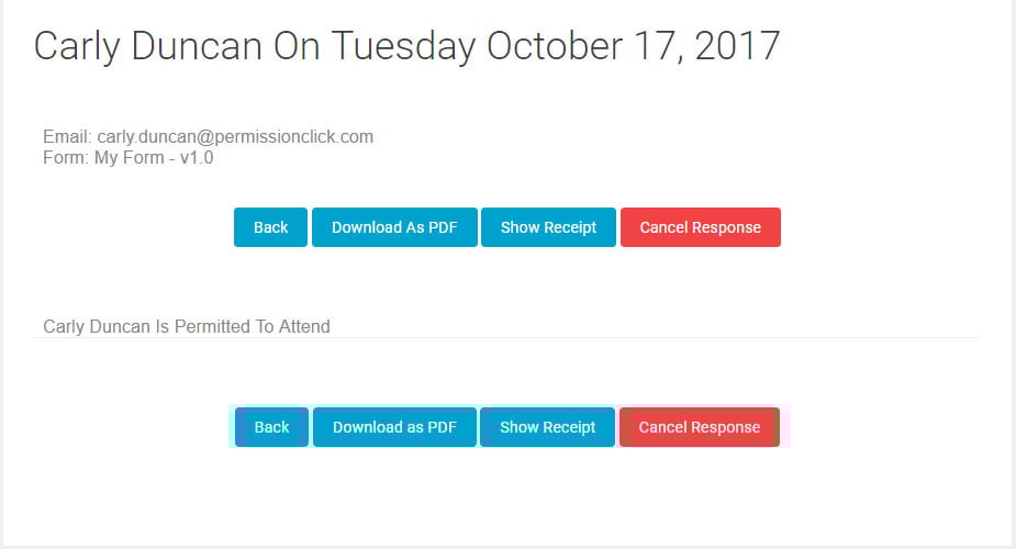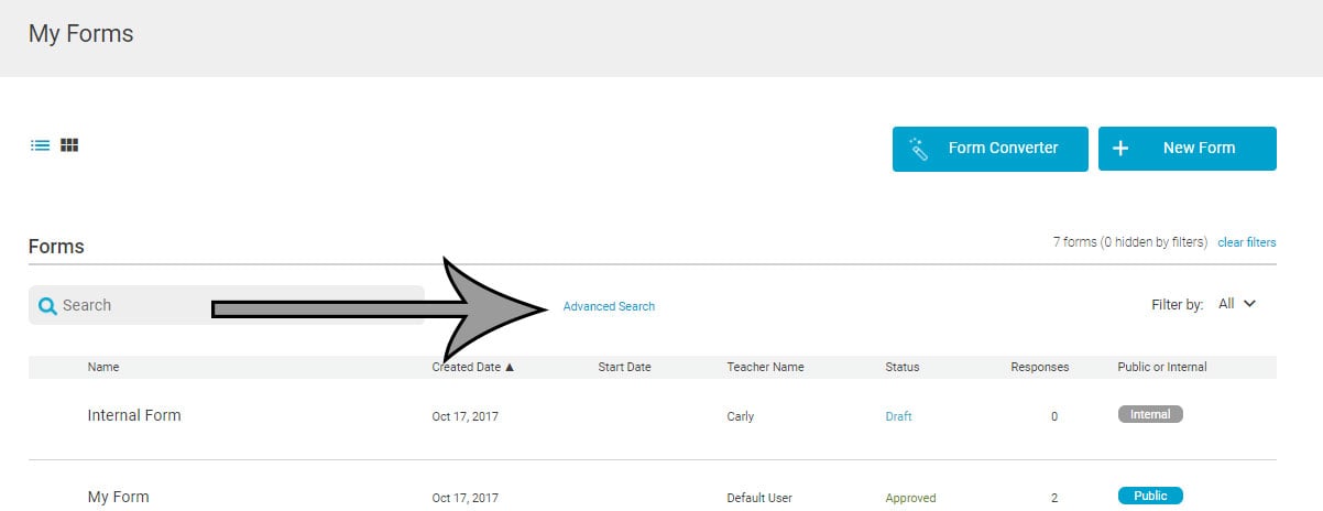 Advanced Search allows a user to search their Permission Click account by name or email address of respondents. Advanced Search is accessed from the My Forms dashboard.