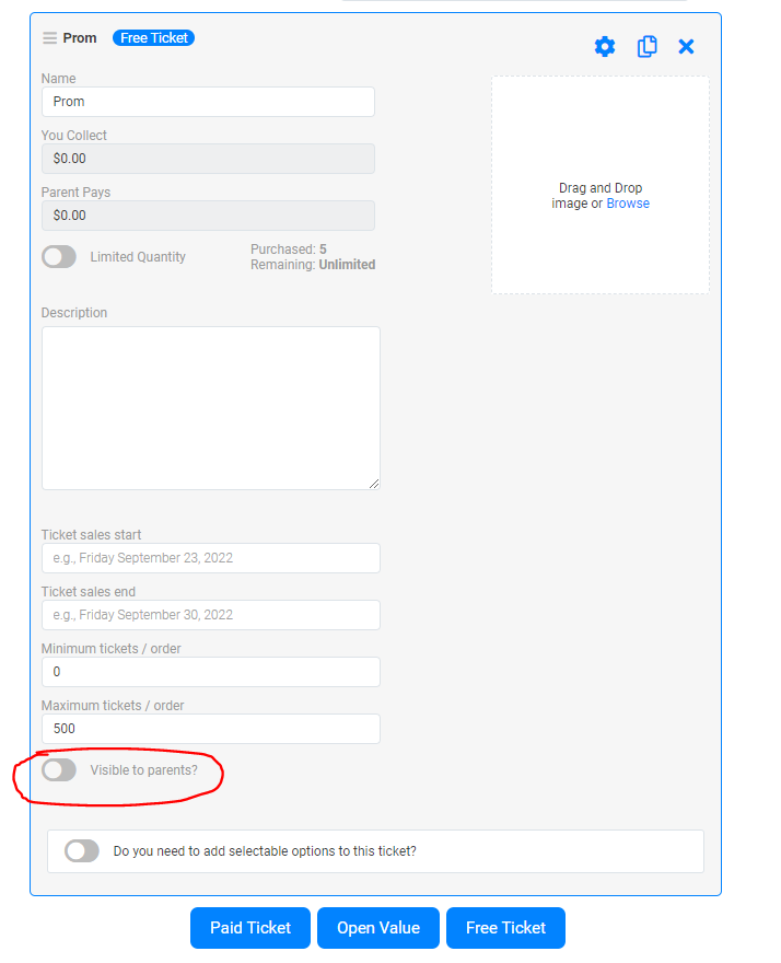 Settings for allowing parents to add tickets to cart