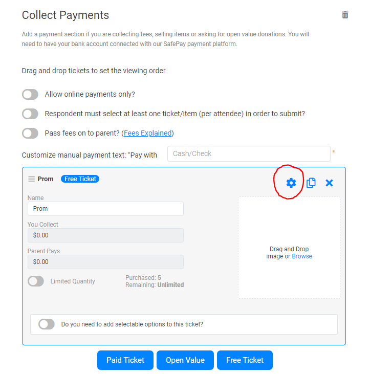 1. In the form builder, click on the Settings icon in the tickets section.