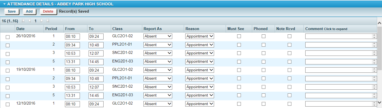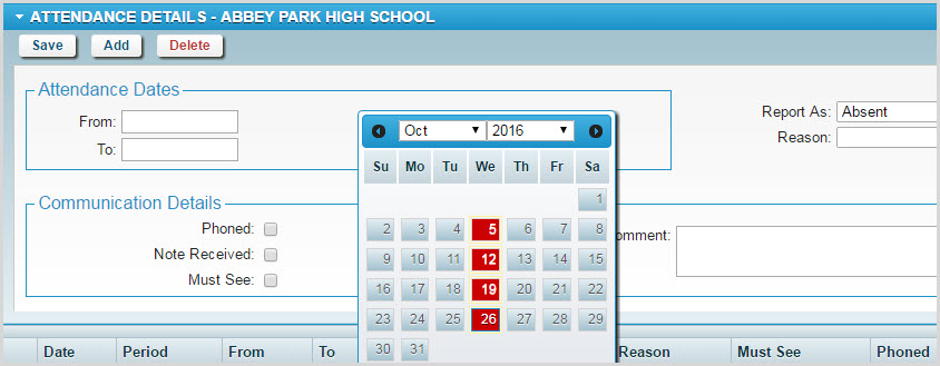 In TWebSchAdmin 5.40.10 and newer, you can select multiple dates for lates or absences. For example: The Student will be away every Wednesday for medical appointments. You can select every Wednesday by clicking on the dates on the calendar and marking the student absent with the reason in advance of the actual date.