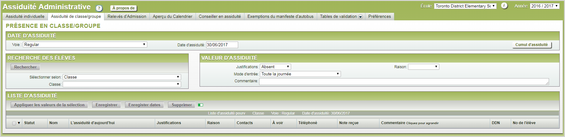 Les élèves qui sont absents ne devraient pas être sélectionnés. Une fois que l'assiduité est enregistrée, les élèves absents garderont le statut préinscrit, l'indicateur NS demeurera, et ces élèves seront au haut de la liste d'élèves.
