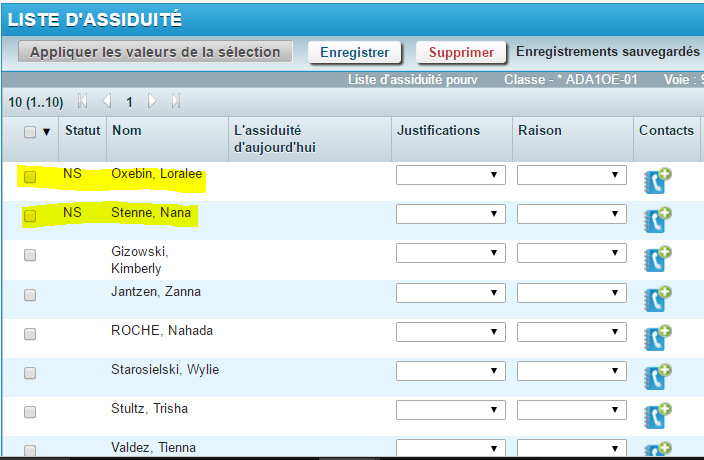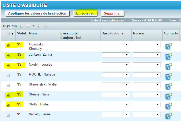 Pour activer les élèves avec l'indicateur NS qui sont présents dans la classe, vous devez les sélectionner et cliquez Enregistrer.Il n'est pas nécessaire d'ajouter une valeur dans le champ Justifications. Ceci supprimera l'indicateur NS et l'élève deviendra actif.