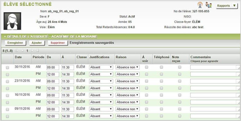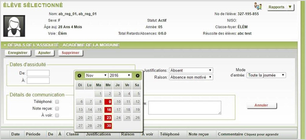 Avec votre élève ouvert dans Assiduité administrative, cliquez sur Ajouter. Une fois que le formulaire change, cliquez sur l'icône du calendrier. Dans la fenêtre contextuelle qui s'ouvre, cliquez sur les jours avec lesquels vous voulez travailler. Avec le code et la raison d'assiduité déjà entrés, cliquez sur Enregistrer.