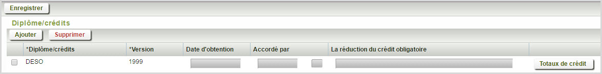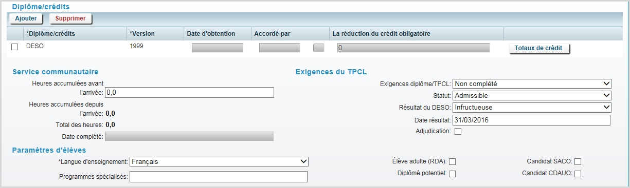 La première fois qu'un utilisateur accède à la section Diplôme/crédits, les valeurs implicites Diplôme DESO 1999 sont affichées. S'il ne s'agit pas du diplôme visé par l'élève, il devra être supprimé et le diplôme approprié devra être ajouté.