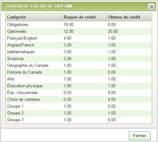 - Cliquez sur Totaux de crédits pour faire apparaître une fenêtre contextuelle, Crédits requis et obtenus par domaine d'exigence, pour le diplôme affecté à l'élève. Les valeurs obligatoires et optionnels sont les seules rangées non variables.