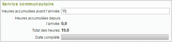 - Heures accumulées depuis l'arrivée indique les heures de service qui ont été soumises pour l'élève sur un bulletin pour toute école dans votre conseil. Cette valeur ne peut pas être modifiée dans cet écran.