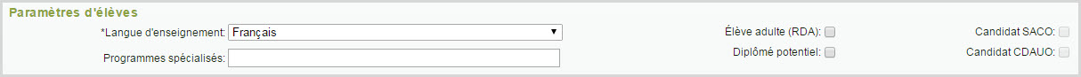 - La valeur implicite du champ Langue d'enseignement est la langue du conseil scolaire lorsqu'un élève est ajouté dans la base de données ou la même valeur que dans son école précédente dans le cas d'un élève transféré.