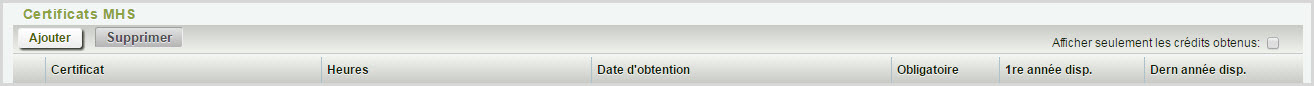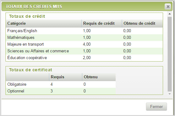 Cliquez sur Total des crédits MHS pour afficher la fenêtre Crédits requis et obtenus par domaine d'exigence pour le secteur MHS visé par l'élève. Les valeurs Obligatoires et Optionnels sont les seules rangées non variables.