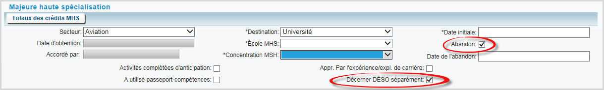 Remarque : Si Abandon est sélectionné, la case Décerner DÉSO séparément est automatiquement sélectionnée :