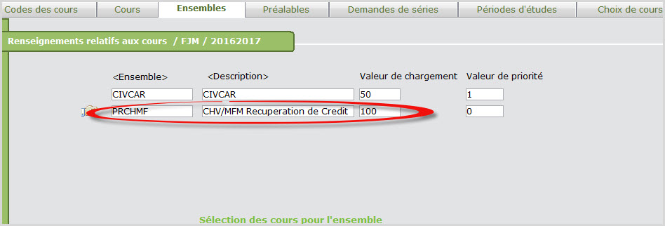 Retournez dans l'écran Cours et créez un ensemble pour chaque scénario de récupération de crédits potentiel. Par exemple, CHV2OR et MFM2PR peuvent être un ensemble pour un groupe d'élèves et CHV2OR, MFM2PR et ENG1OR peuvent être un ensemble pour un autre groupe d'élèves.