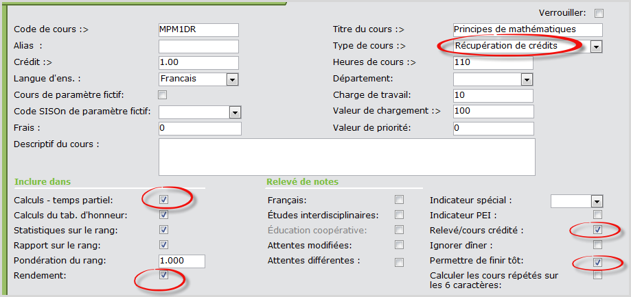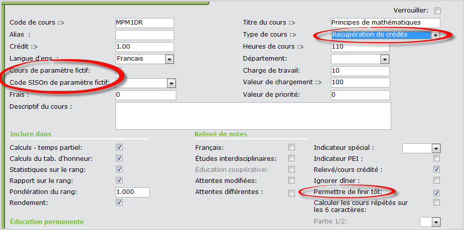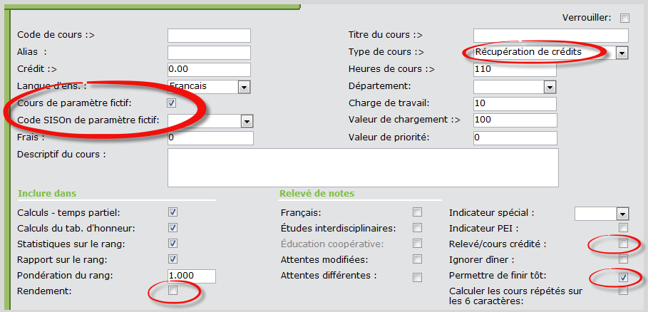 Remarque : Le Type de cours doit être Récupération de crédits et la case Permettre de finir tôtdoit être cochée. Cours de paramètre fictifet Code SISOn de paramètre fictif ne sont pas requis puisqu'il s'agit du cours réel dans lequel l'élève sera placé.