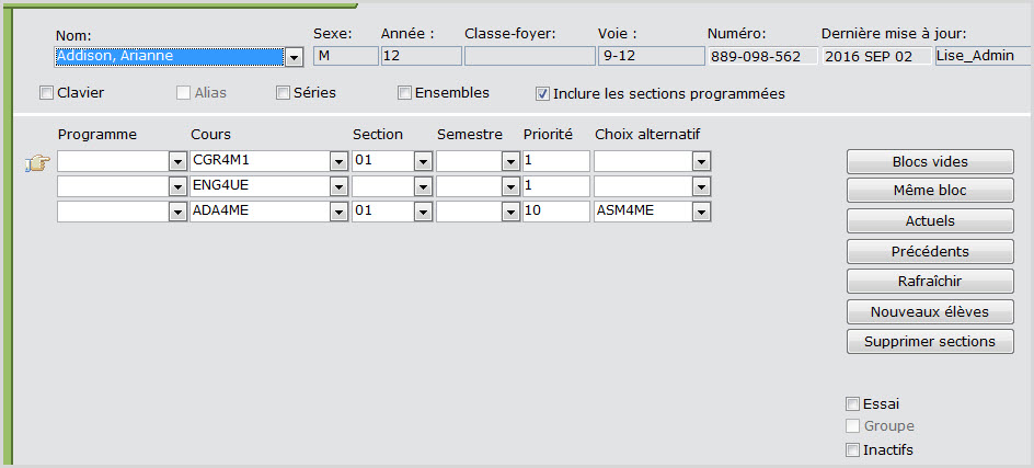 Pour abandonner un des composants de l'ensemble pour un élève qui est programmé dans chacune des parties d'un ensemble de récupération de crédits, mais qui a complété un de ces composants, supprimez l'ensemble dans la page Choix de courset ENREGISTREZ. Puis, avec la case à cocherInclure les sections programméescochée, cliquez surRafraîchier. Les composants s'afficheront et vous pouvez maintenant vous défaire du cours approprié et reprogrammer les cours de l'élève, ce qui laissera le cours restant dans l'onglet Choix de cours.