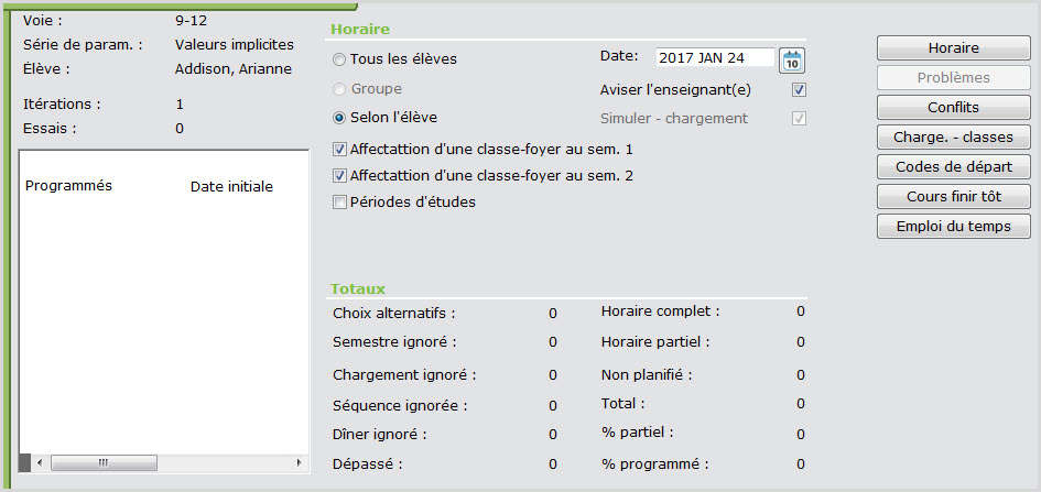 Remarque : N'oubliez pas de sélectionner la bonneDate en vigueur avant de créer l'horaire de votre élève.