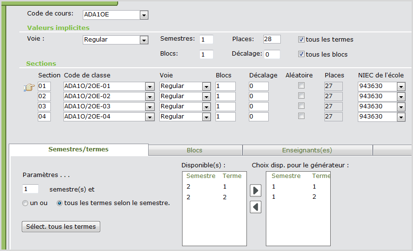 Remarque importante :Tout cours de paramètre fictif doit être remplacé par le code de cours proprement dit avant la première soumission SISOn (le 31 octobre).