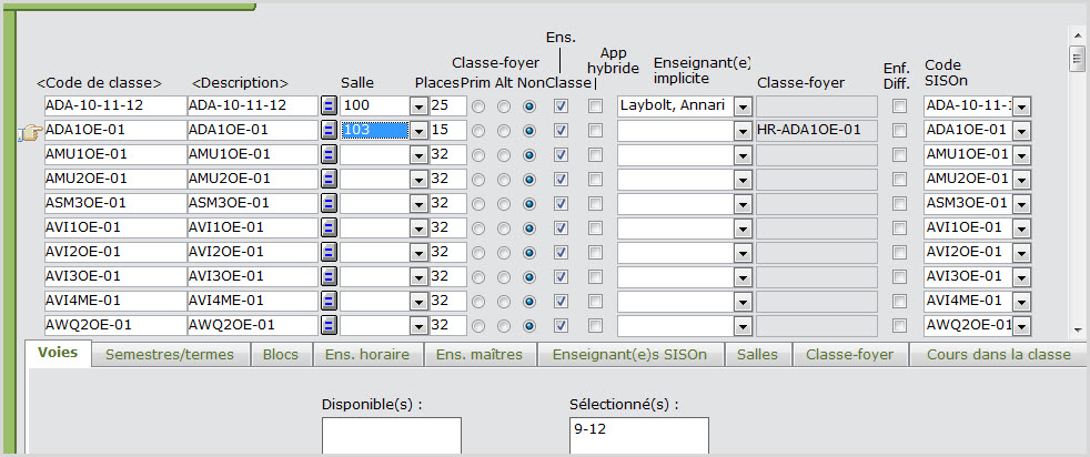Dans la page Classes, assignez les renseignements suivants : voie, semestre, bloc, enseignant et salle. Assurez-vous que le code de classe commence par RCR.