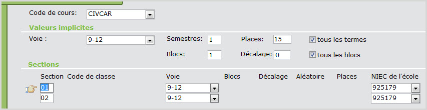 Dans la page Horaire, créez le nombre de sections requises pour chaque cours de récupération de crédits (p. ex., RCR1OR-01).