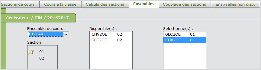 Une fois que les sections ont été créées pour le ou les ensembles, liez le cours de récupération de crédits à ou aux ensembles dans l'onglet Ensembles du Générateur.