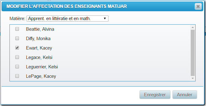 Bouton Modifier : cliquer sur ce bouton ouvre la liste des enseignants disponibles et les ajoute ou les enlève de la liste des enseignants de M/J pour la matière sélectionnée.