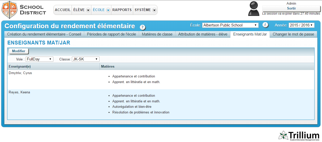 Actuellement, la page Trillium de base > Rendement élémentaire > Matières M/J peut être utilisée pour affecter les premier et deuxième enseignants aux matières M/J. Il se peut toutefois que vous deviez affecter plus de deux enseignants par matière M/J. C'est dans cette éventualité que la page Configuration du rendement élémentaire > Enseignant M/J, dans TWebSchAdmin, entre en jeu.