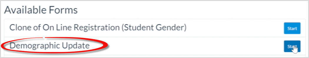 - When you log in, scroll down to Available Forms. We cannot guarantee your school will literally name the form you need Demographic Update, but the form name may very well have Demographic Update as a part of it. Click Start, at right.