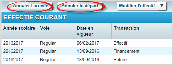 Si un élève a plusieurs transactions d'effectif dans l'année courante (par exemple, s'il a été inscrit, puis qu'il a quitté l'école et qu'il est maintenant de retour), vous pouvez modifier seulementl'enregistrement d'effectif le plus récent.