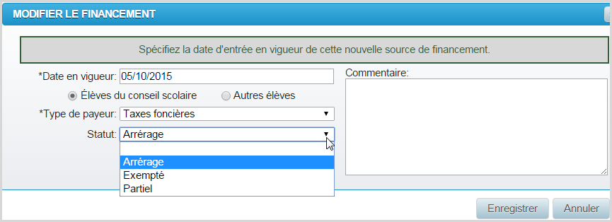 Statut : L'état actuel du financement pour cet élève, par exemple Partiel, Arrérage ou Exempté.