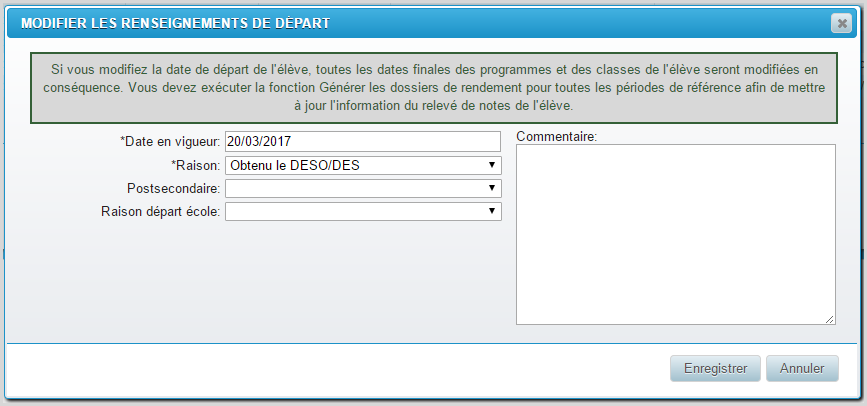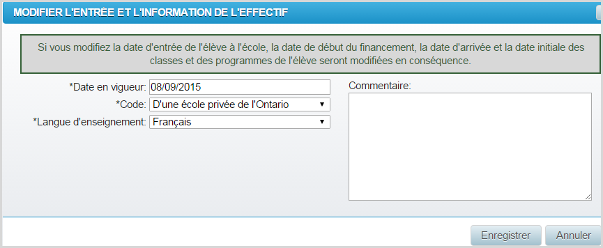 Si l'élève passe d'un registre à un autre, modifiez aussi la Date en vigueur.