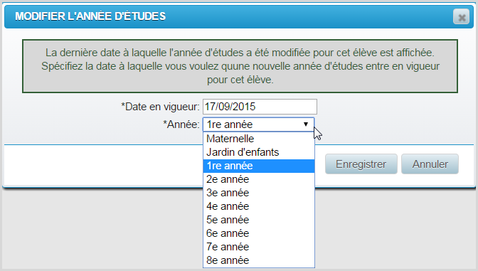 La Date en vigueur peut être modifiée si l'année d'études de l'élève change durant l'année scolaire.