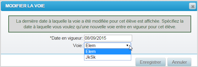 Si l'élève change de Voie, vous devez aussi entrer la Date en vigueur.