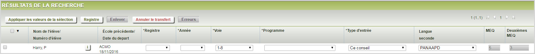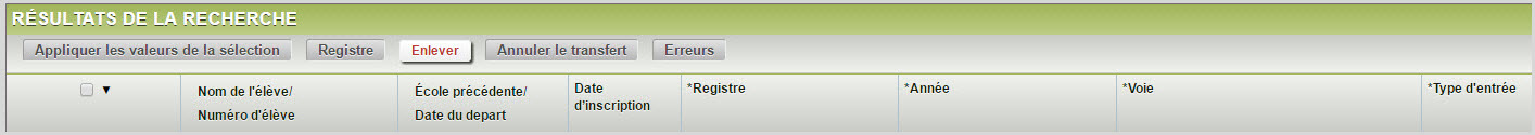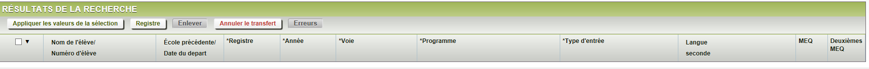 Cette section affiche la liste des élèves qui correspondent à vos critères de recherche. Vous pourrez inscrire, désinscrire ou annuler le transfert du ou des élèves sélectionnés.