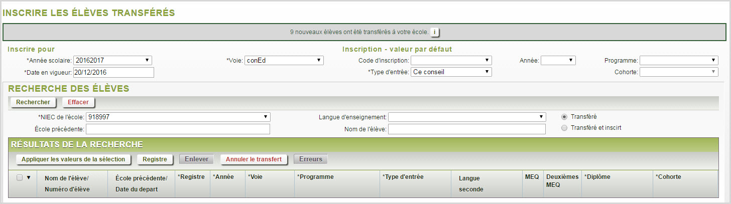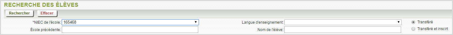 Lorsque Transféré et inscrit est sélectionné dans la section Recherche des élèves :