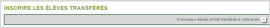 Un message est affiché dans le haut de la page, indiquant le nombre total d'élèves qui ont été transférés dans votre école et qui n'ont pas encore été inscrits. Cliquez sur l'icône d'information, , pour ouvrir une fenêtre contextuelle indiquant le nombre d'élèves transférés et non encore inscrits regroupés selon l'année durant laquelle ils ont été transférés.