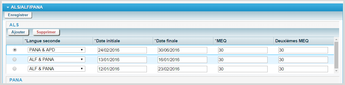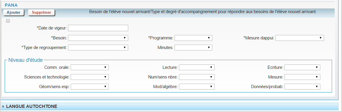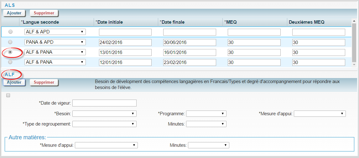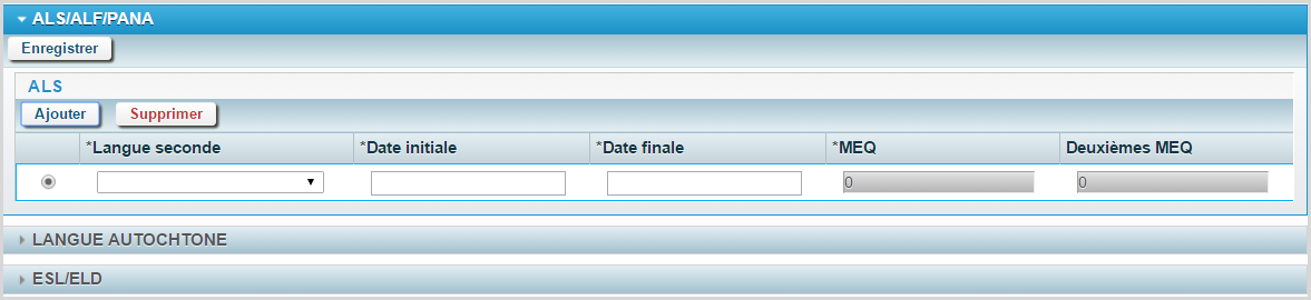 Cliquez sur le bouton Ajouter correspondant pour ajouter une nouvelle rangée dans une des catégories suivantes : AFL/APD/Anglais, Langue autochtone ou Programme de rattrapage.