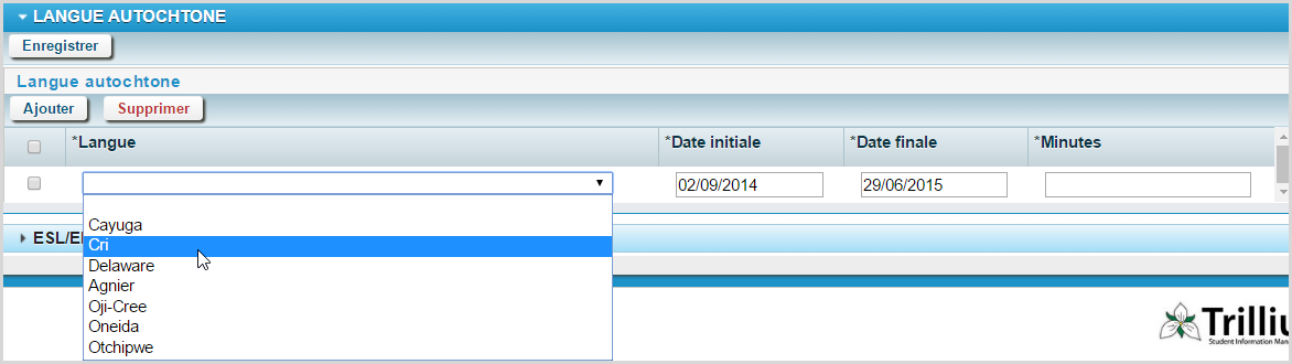 Une liste déroulante contenant les valeurs Cayuga, Cree, Delaware, Mohawk, Oji-Cree, Oneida et Ojibwe. Sélectionnez la langue autochtone apprise par l'élève.