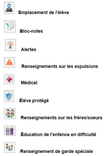 Une fois que vous avez cliqué sur le nom d'un élève et que ses renseignements sont ouverts, il se peut qu'il y ait des icônes visibles dans le coin supérieur droit (si vous disposez des privilèges de sécurité appropriés). Une explication s'affiche lorsque vous passez le pointeur de la souris sur ces icônes, et une fenêtre contextuelle s'affiche lorsque vous cliquez dessus (à l'exception de l'icône Élève protégé), contenant des renseignements supplémentaires sur l'élève particulier. Voici la liste des icônes qui peuvent apparaître :