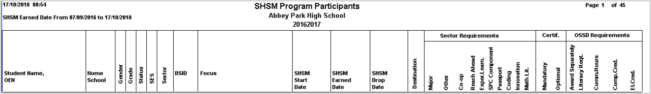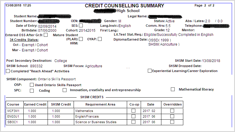 - The report remains a single page and now displays either the text and checkboxes for the OSP or the SPC, based on the student’s SHSM Component value.