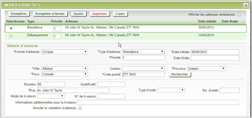 Lorsque vous modifiez des adresses dans Mise à jour des élèves, vous êtes dans la fenêtre contextuelle suivante :