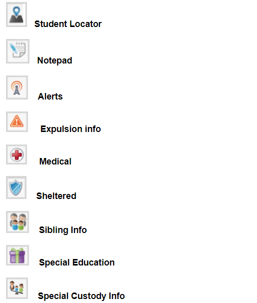 After you've clicked a Student's name and their information is open, they may have icons visible at top, right (if you have proper security access). Hovering over the icon displays an explanation, while clicking on any of them (other than Sheltered Student) produces a pop-up providing this particular student's additional information. Icons which may appear here include: