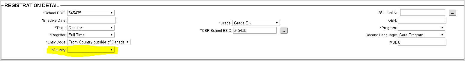 The Student Registration page allows you to enter/update the details required to register a student in Trillium. The few fields are populated from the Online Registration’s Submission file. School Staff can update the values if required.