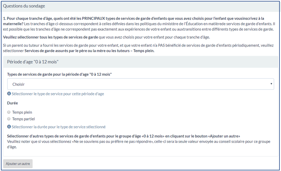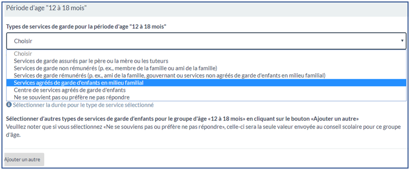 Concerne les types de services de garde dont cet élève a fait l'expérience. Il s'agit de la première question, sur quatre, divisée par tranches d'âge. Contrairement aux trois autres, cette question accepte plusieurs réponses par tranche d'âge. Comme c'est le cas pour plusieurs réponses dans cette enquête, commencez par faire un choix dans la liste déroulante (comme illustré dans la deuxième capture d'écran ci-dessous) pour la question principale (dans ce cas : Types de services de garde. Vous voyez que Services agréés de garde d'enfants en milieu familial est la réponse choisie) puis vous remplissez les détails (dans ce cas : La durée, comme montré dans la première saisie d'écran). Si votre enfant a eu plus d'une expérience dans une tranche d'âge donnée, cliquez surAjouter un autre(montré dans la deuxième saisie d'écran). Vous devriez pouvoir fournir jusqu'à six centres de services de garde par tranche d'âge.