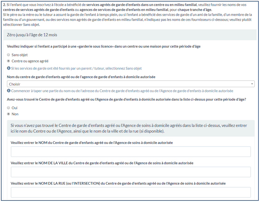 Demande si votre enfant était dans un centre agréé et, le cas échéant, lequel. Vous pouvez entrer une réponse par tranche d'âge. Dans l'exemple, notre répondant a choisi Centre ou agence agréé, ce qui a ouvert une barre de recherche. Commencez à taper le nom du centre ou une partie de l'adresse et Via affichera les centres correspondant au critère que vous avez tapé dans la barre de recherche. Si vous voyez le centre que vous cherchez, cliquez dessus. Si vous ne voyez le nom de votre centre dans la liste déroulante, cliquez surNonà la question vous demandant si vous l'avez trouvé. Ceci ouvrira, comme illustré ci-dessous, les prochains champs de saisie de texte pour le nom du centre, le nom de sa ville et le nom de sa rue. Si vous entrez manuellement le nom d'un centre ici, cela écrasera toute valeur pouvant avoir été sélectionnée dans la liste.