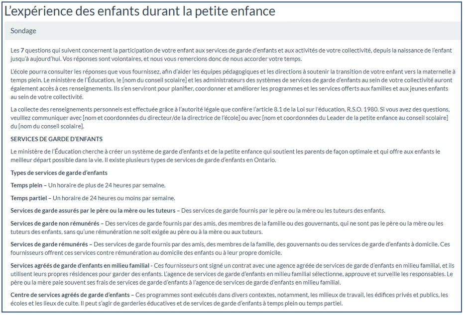 Les parents qui remplissent un formulaire d'inscription vont trouver une question au bas du formulaire, leur demandant s'ils souhaitent participer à une enquête facultative. S'ils acceptent, ils arriveront au formulaire que vous voyez dans le haut de la présente page.